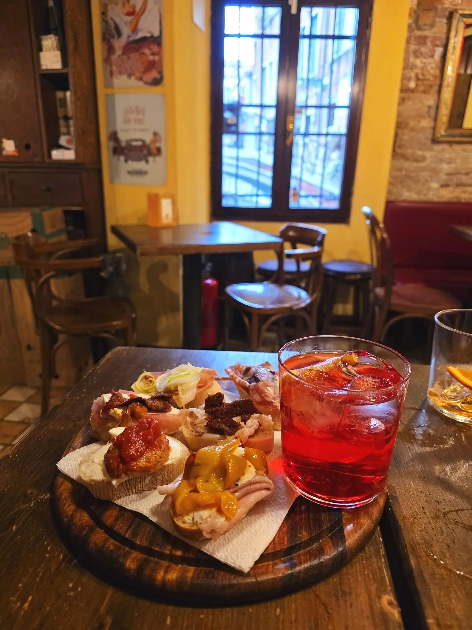 I also highly recommend bar hopping for cicchetti and aperitivo. Cicchetti is like Venetian tapas served in bars called Bacari. The cicchetti is usually small plates involving bread with a variety of different toppings including meats, cheese, pate, fish and more. With an aperitivo like Aperol spritz, Campari spritz, Hugo spritz or wine.
